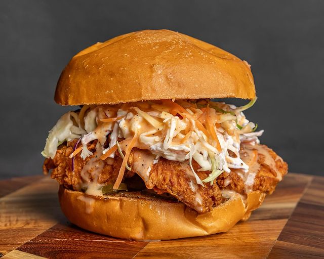 Whole Nashville spiced chicken breast with coleslaw, sweet pickles, comeback sauce on a brioche bun or cheddar waffle