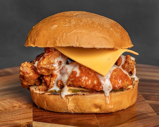 Whole chicken breast drenched in buffalo sauce, sweet pickles, cheese and buttermilk Ranch on a brioche bun.
